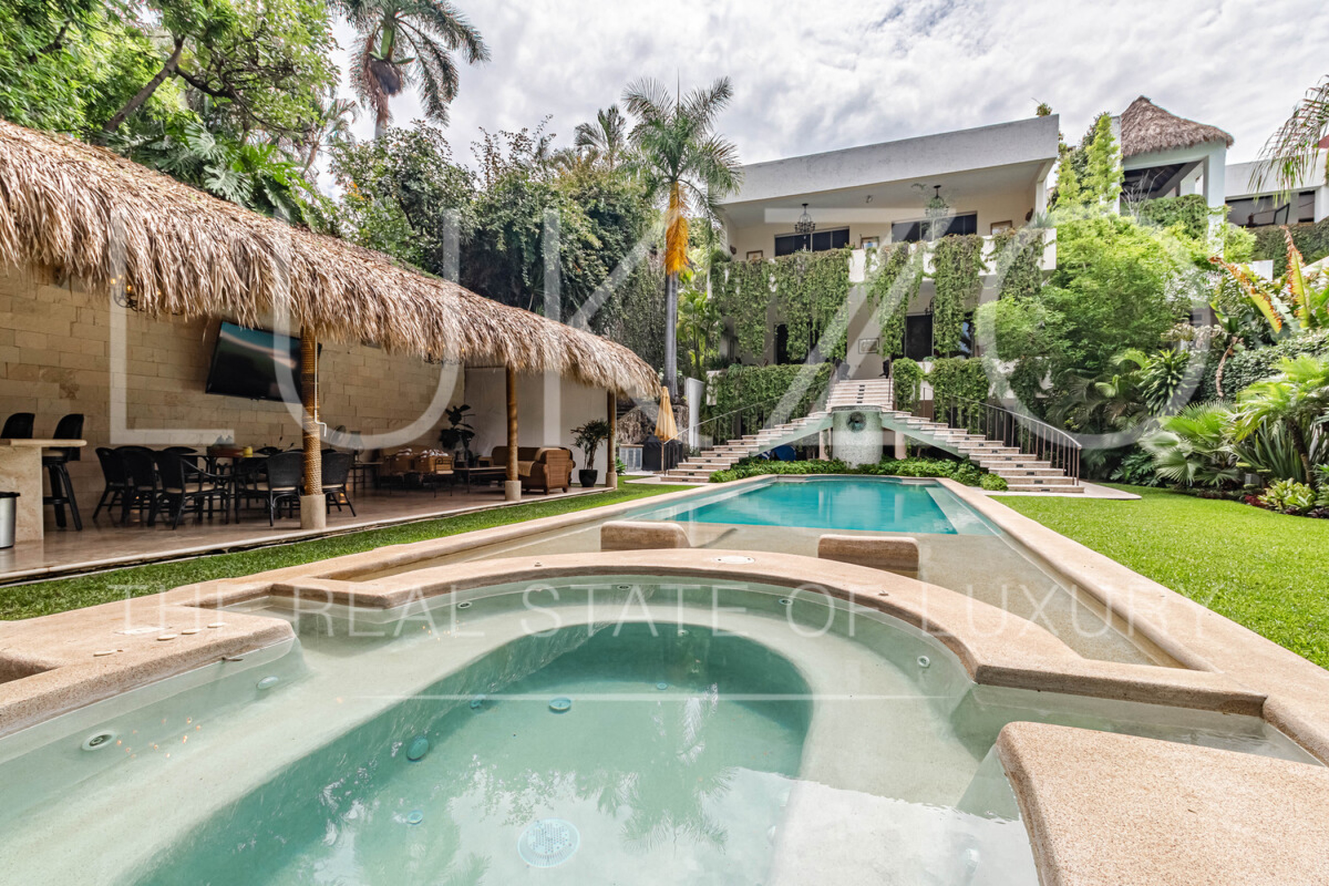 Casa en la zona central de Cuernavaca. El clima es cálido. Los techos son altos lo que hacen que la casa sea muy fresca. La escalera es una espiral y la adorna una bóveda. La casa cuenta con tres niveles y en cada nivel hay una terraza con vista al jardin y alberca. Además de estas terrazas hay una palapa junto a la alberca con barra de bar y baño completo para dar servicio a esta área. Es perfecta para hacer reuniones con familia y amigos. Esta casa está construida en un terreno descendente por lo que la entrada es al nivel de las recámaras y bajas a sala comedor, sala de TV y en el último piso hay más recámaras y la salida hacia el jardín y la alberca. Filtro de agua para toda la casa. ¡Ven a conocerla!