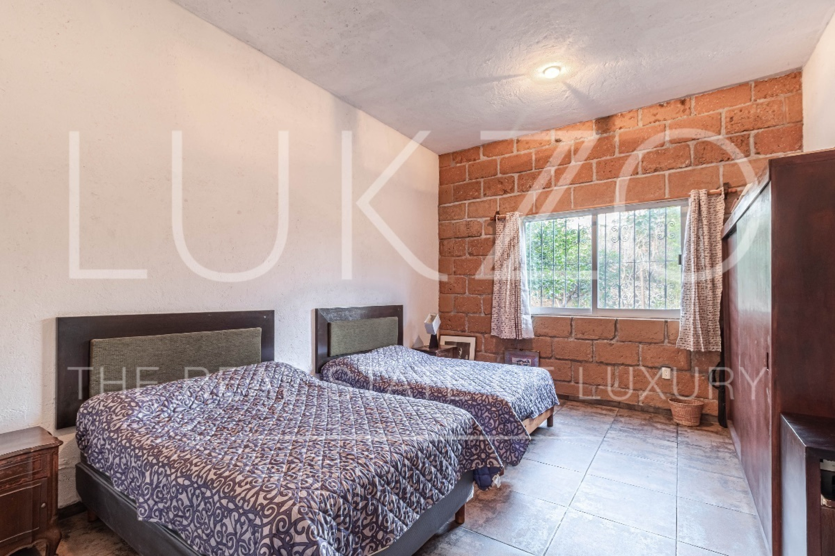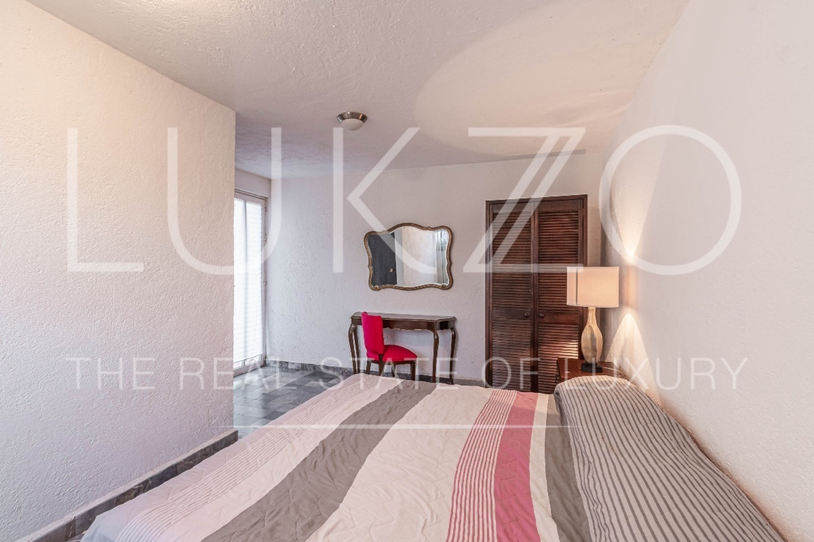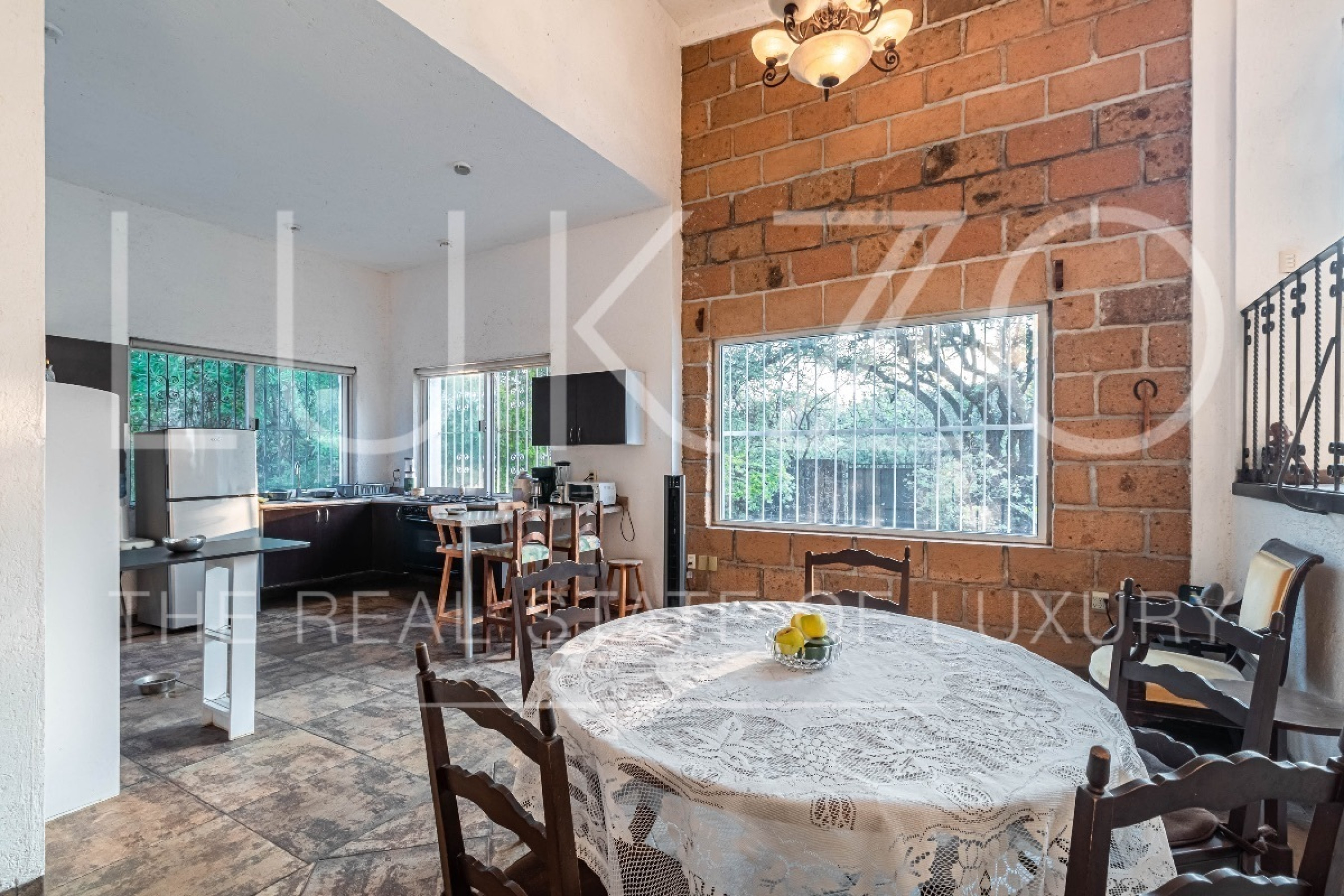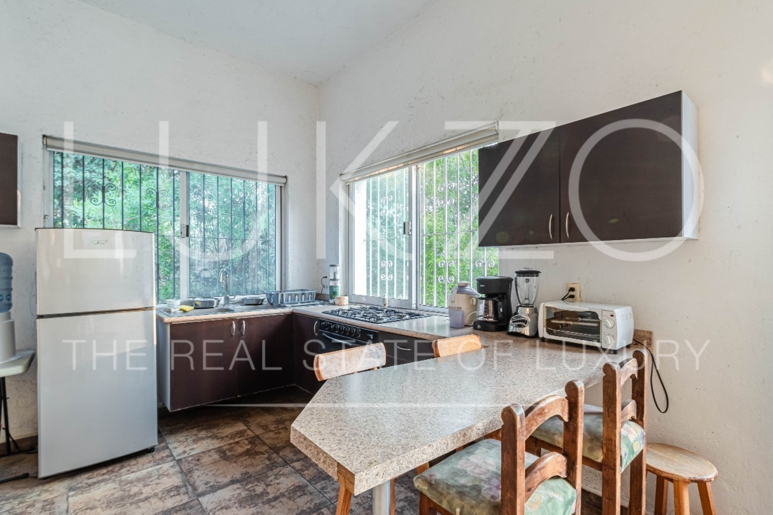Al entrar, te recibirán un área de sala conectada por un desnivel al comedor y una cocina abierta con una práctica barra. La casa cuenta con dos recámaras, una de ellas con capacidad para dos camas Queen y la otra para una cama King y un clóset. Además, en el exterior de la propiedad, se encuentra un cuarto de servicio o tercera recámara con baño independiente.